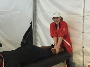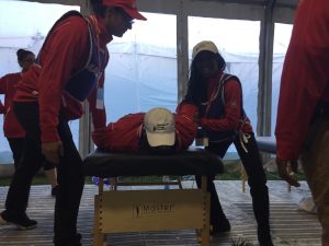From 9am to 10am the students practice on each other, and we pace the tent correcting techniques, talking the students through stretches for particular muscles, cramp relief for various regions, and reminding them: feet on the table in supine, feet off the table in prone.  Although most students seem cool enough, a few still have some nervousness to burn through.  We will give those students the first runners, because it’s sink or swim time, and we know they almost always swim.