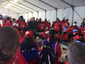Around 7:30am Hovi leads his therapists to the medical tent for orientation, and we take the current students to the Balboa Hospitality Tent where we’ll be working.  Upon our arrival the students will pick the table they will use (at least at first) and who they will partner with.  We have 45 tables this year for about 65 students, so at some point we’ll have to divide them up and have one person per table.  We sip coffee and wait for Hovi to come back, and we watch the TV monitor in the main tent to see how the runners are doing.